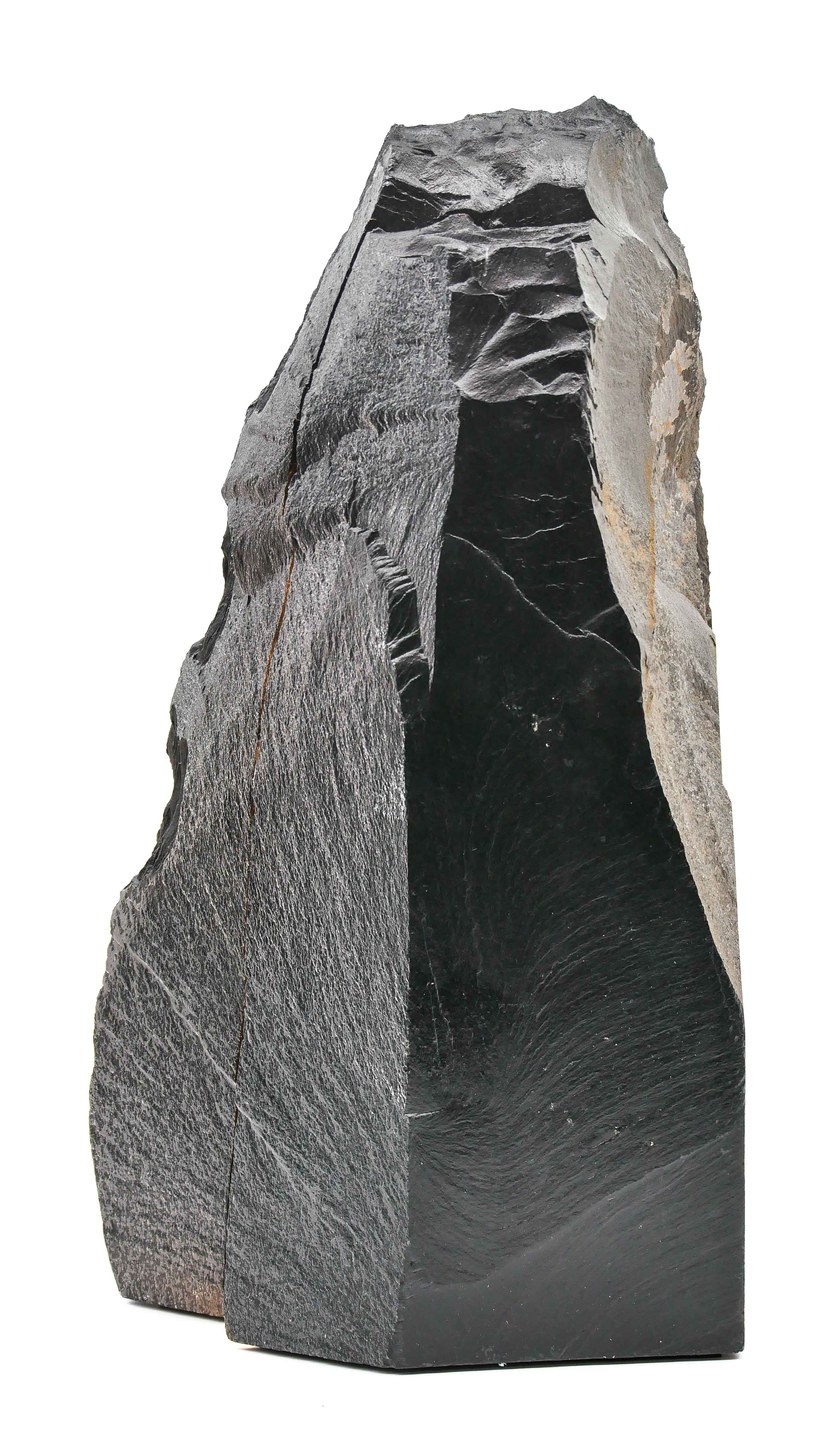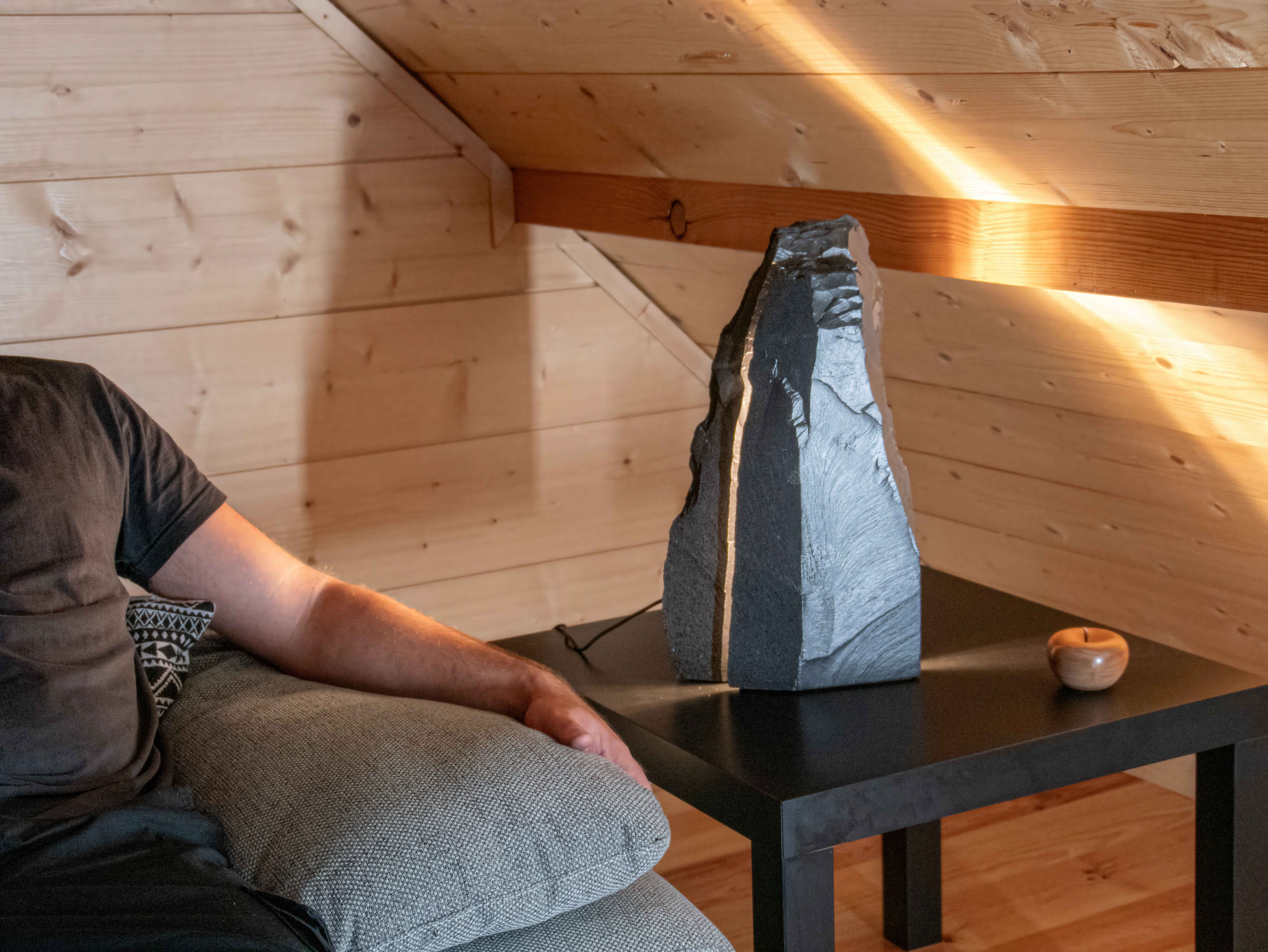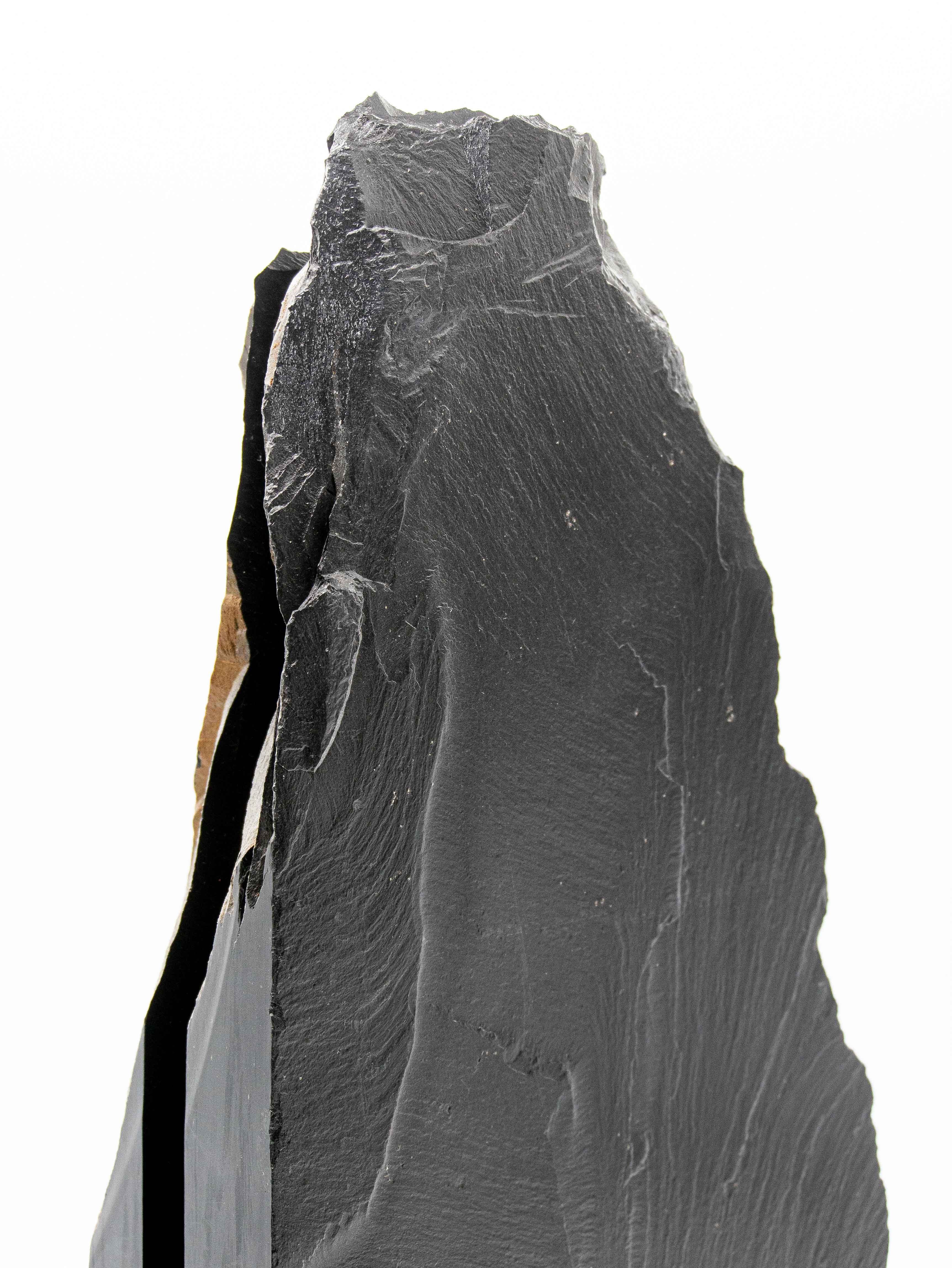 Extrait d’ardoise est un luminaire issu de l’observation de l’étape d’extraction, il s’est distingué lors de la sélection par sa singularité. Ce bloc captivant présente un ensemble de caractéristiques uniques : délits légèrement tapissés de quartz, cassures, veinage brut texturé et forme pointue. Il incarne à lui seul une diversité d’éléments observables lors de l’extraction de l’ardoise. Sa silhouette est sublimée par une fente lumineuse qui, de face, laisse la pierre opaque. En changeant de perspective, son cœur se révèle, dévoilant un veinage naturel issu du clivage ardoisier. Cette pièce est ainsi le reflet du processus d’extraction, alliant beauté brute et raffinement.