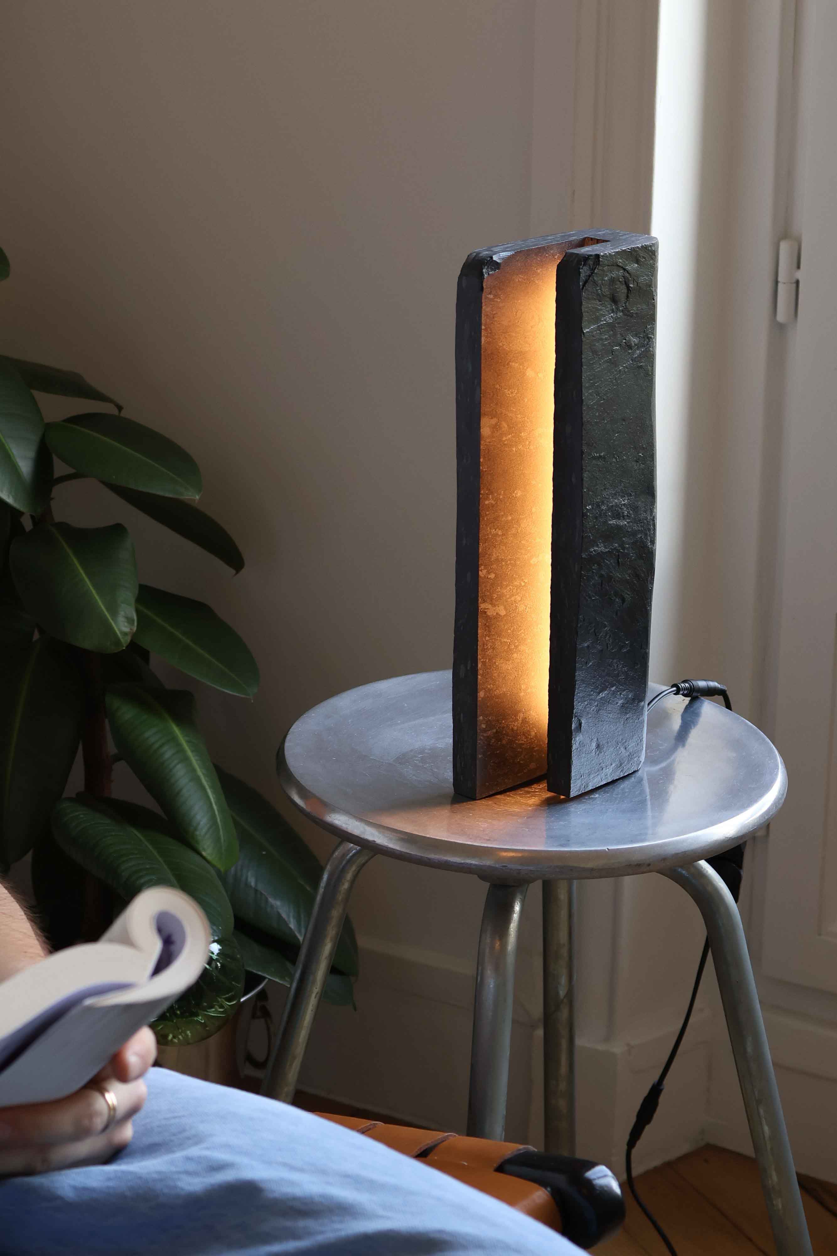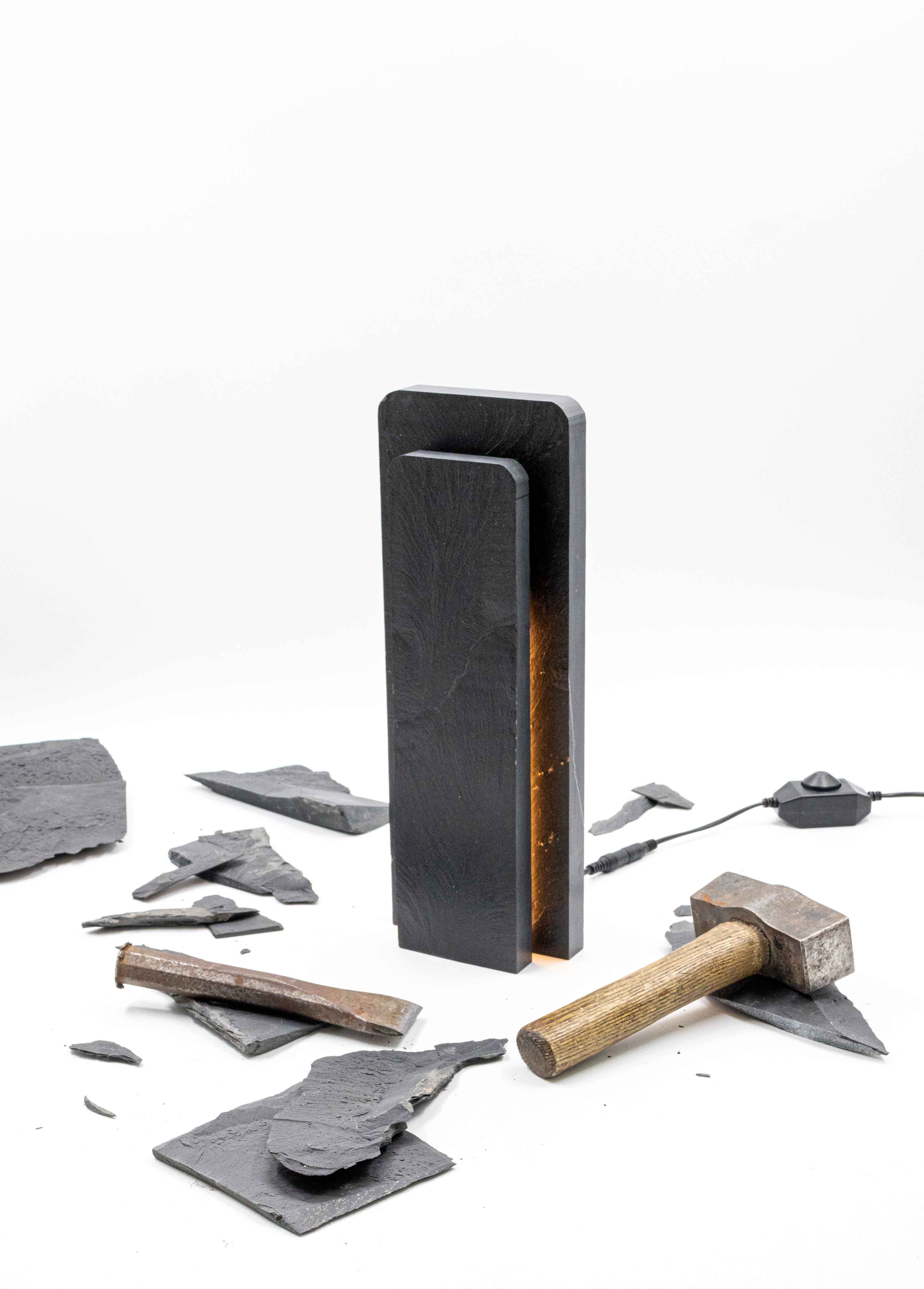 Fusionnant l’héritage ardoisier avec une approche contemporaine, ces lampes à poser en ardoise des Pyrénées utilisent les gestes ancestraux ardoisiers et mettent en lumière les caractéristiques exceptionnelles de l’ardoise telles que ses strates, le veinage provoqué par le clivage du maître fendeur, son aspect scié et poli, ou encore ses reflets.