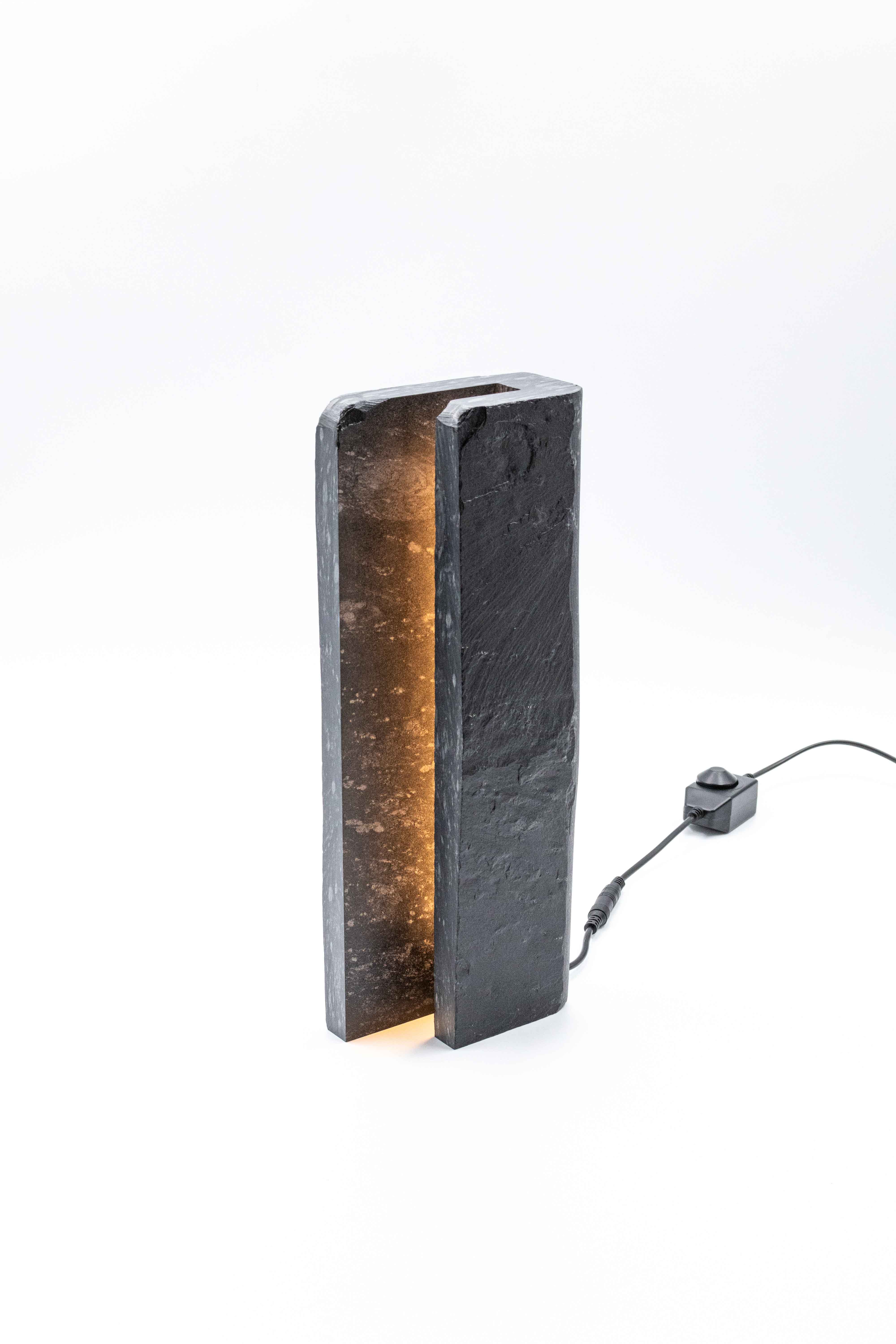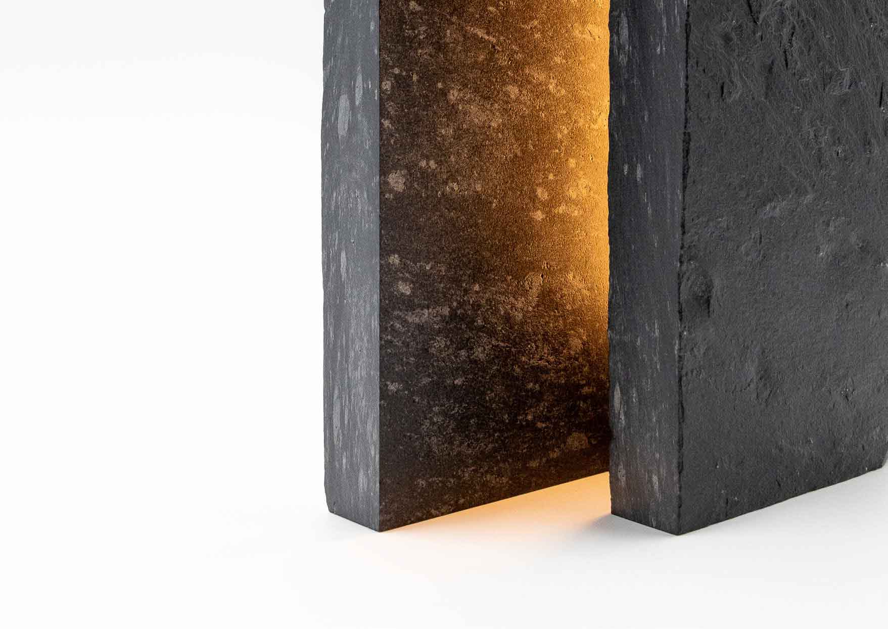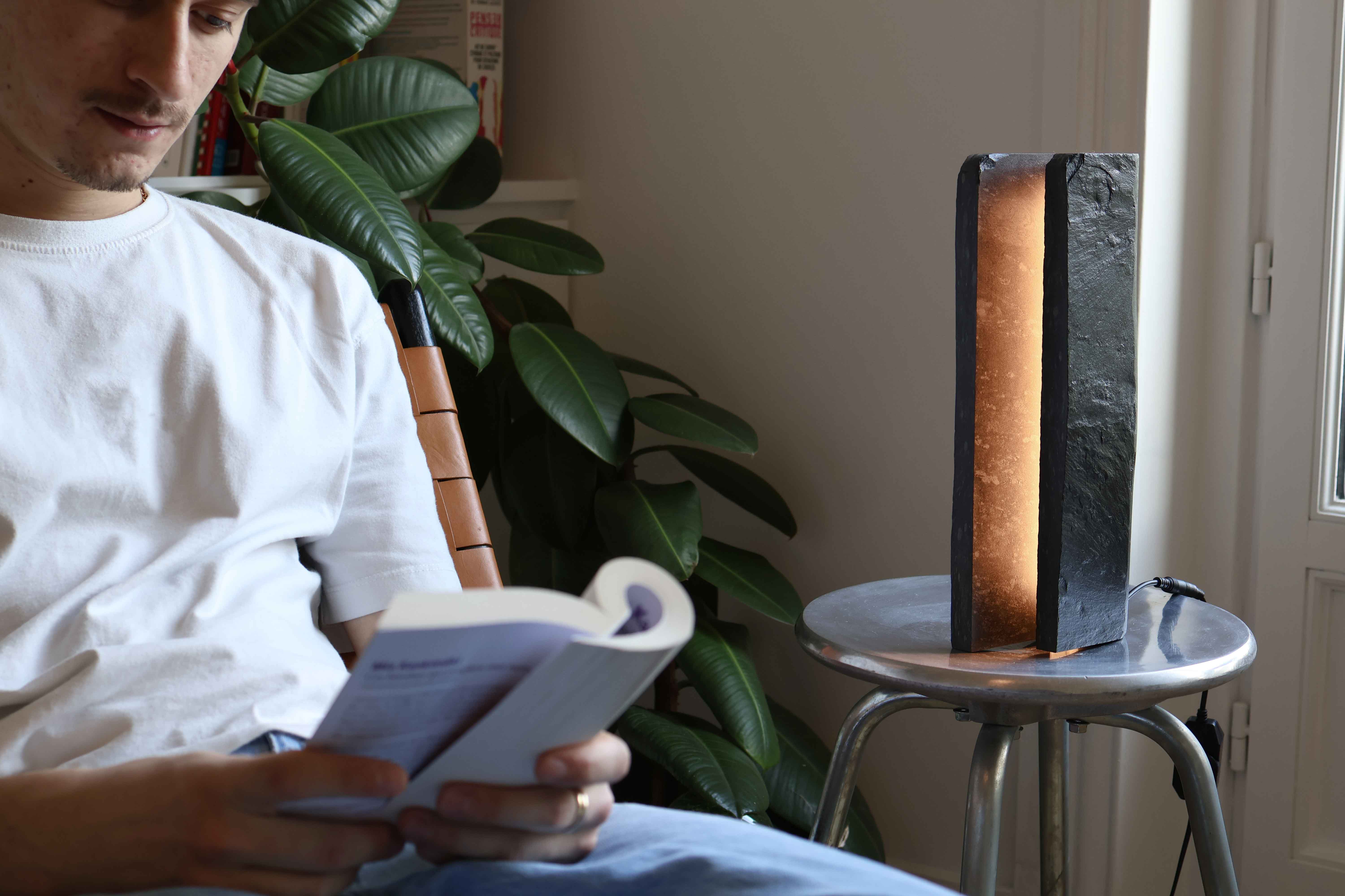 Monolithe quartz est façonné à partir d’un bloc d’ardoise imprégnée de quartz. Rare, ce type de matière offre de nouvelles textures mouchetées. Sur les faces sciées, nous avons accès au cœur de l’ardoise et aux éclats de quartz qui parsèment l’ensemble. Les faces fendues, particulièrement brutes, confèrent à chaque lampe une unicité encore plus marquée.