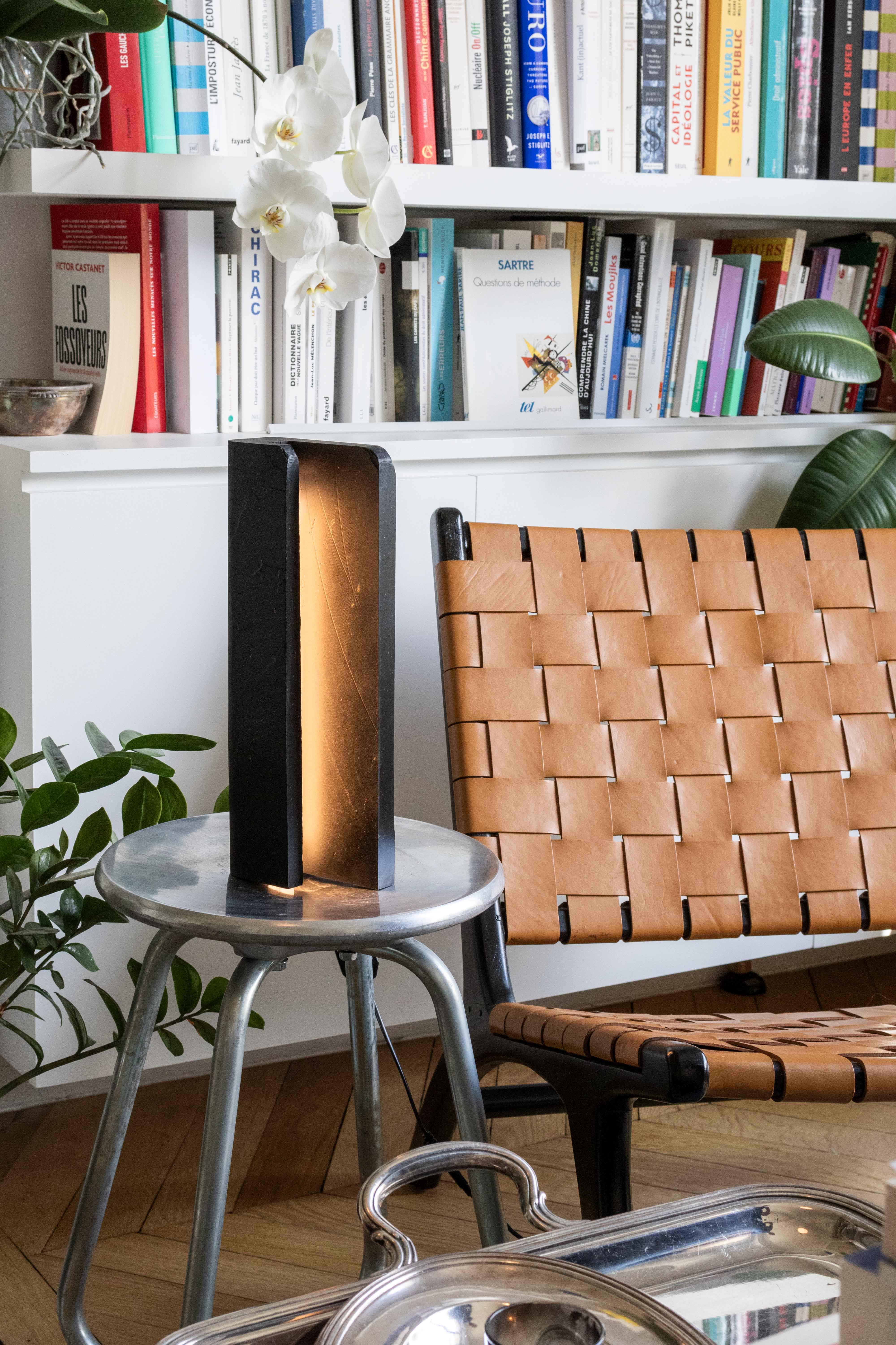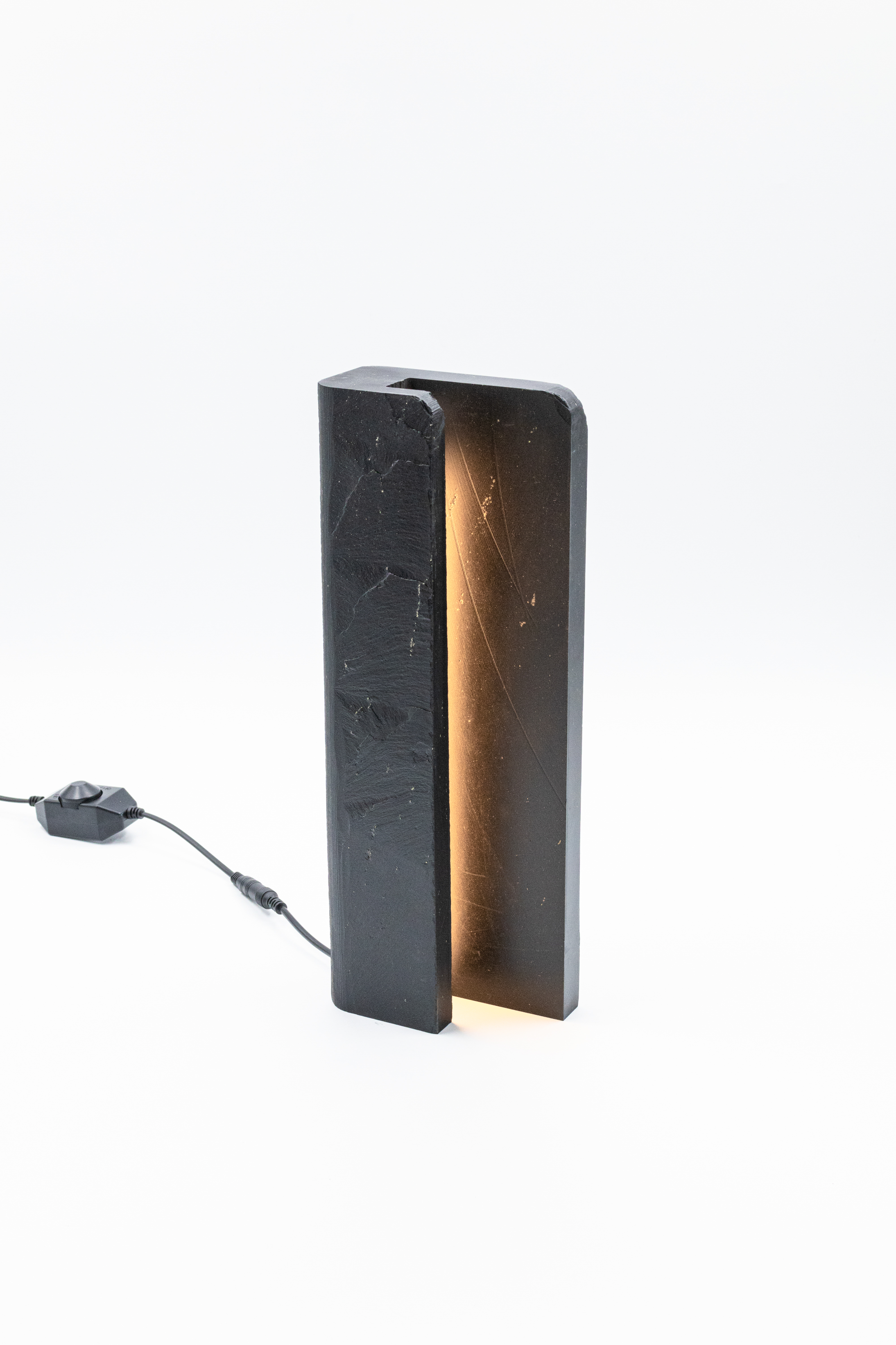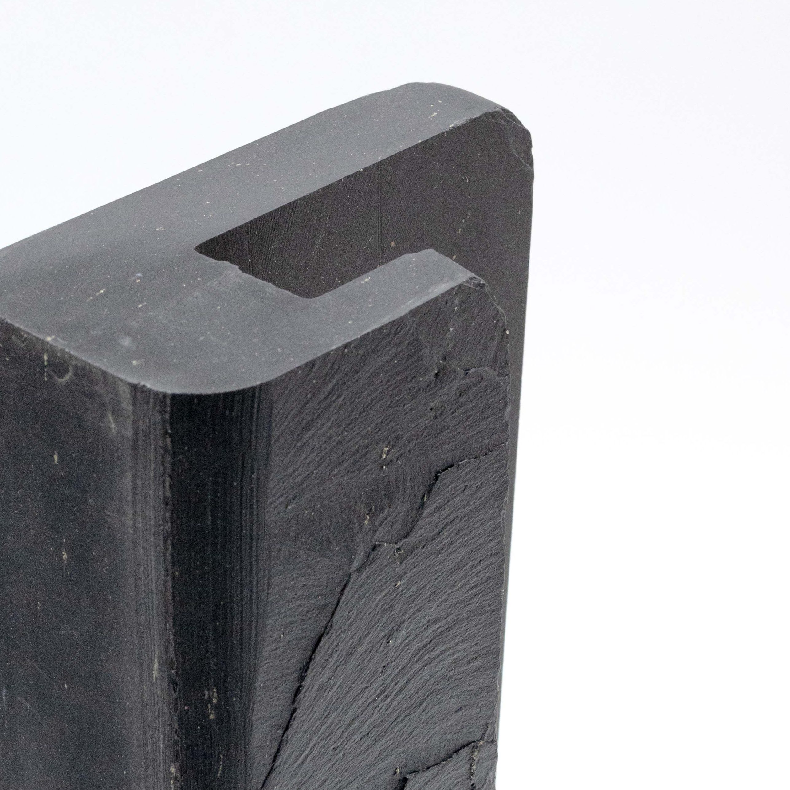 Le luminaire Monolithe a pour particularité d’être façonné d’un seul bloc d’ardoise, à gros grain, spécialement sélectionné pour l’occasion. Sa forme vient effleurer les limites techniques de l’ardoise des Pyrénées et utilise les principaux savoir-faire ancestraux ardoisiers, tels que le clivage et le sciage.