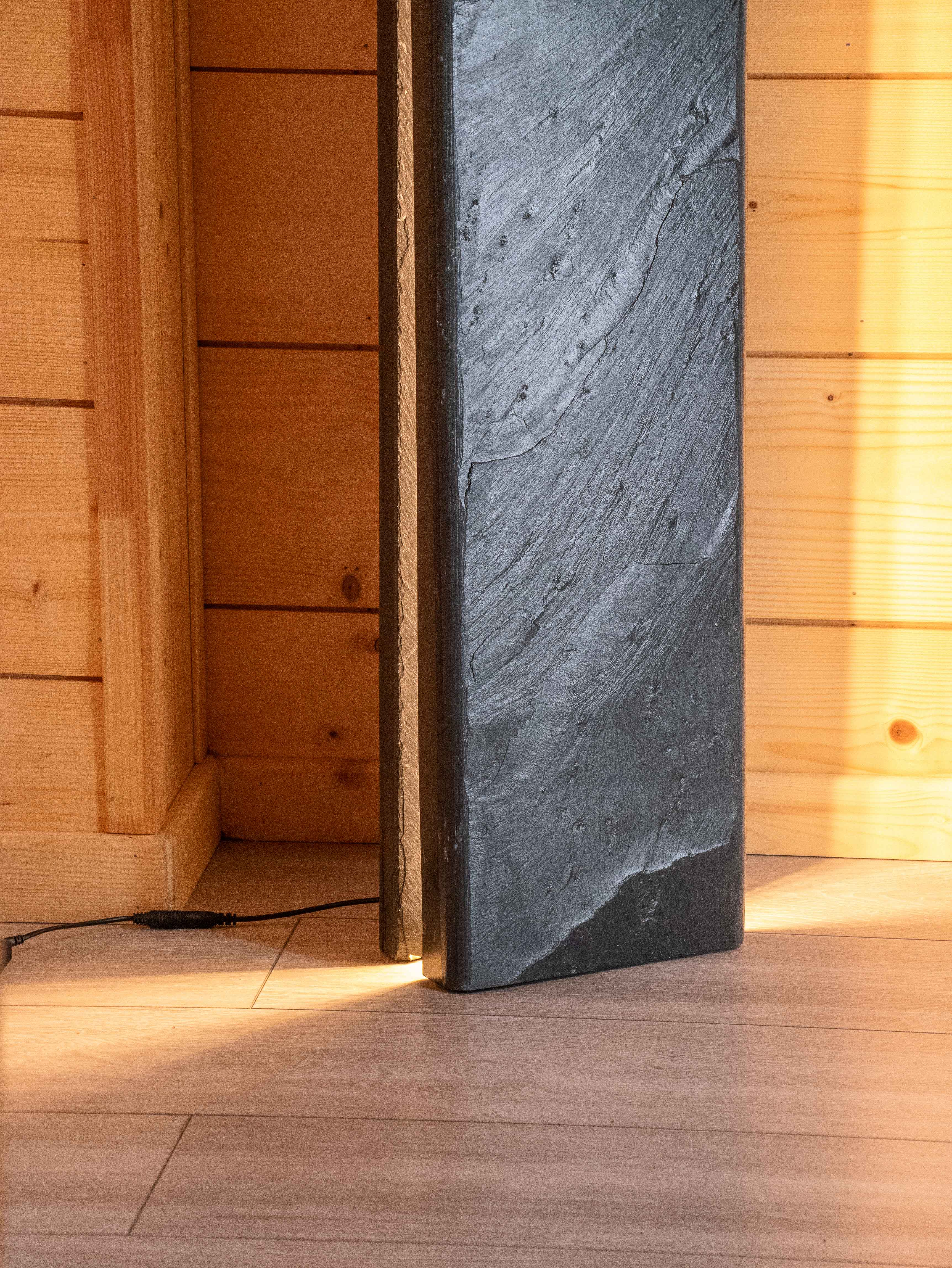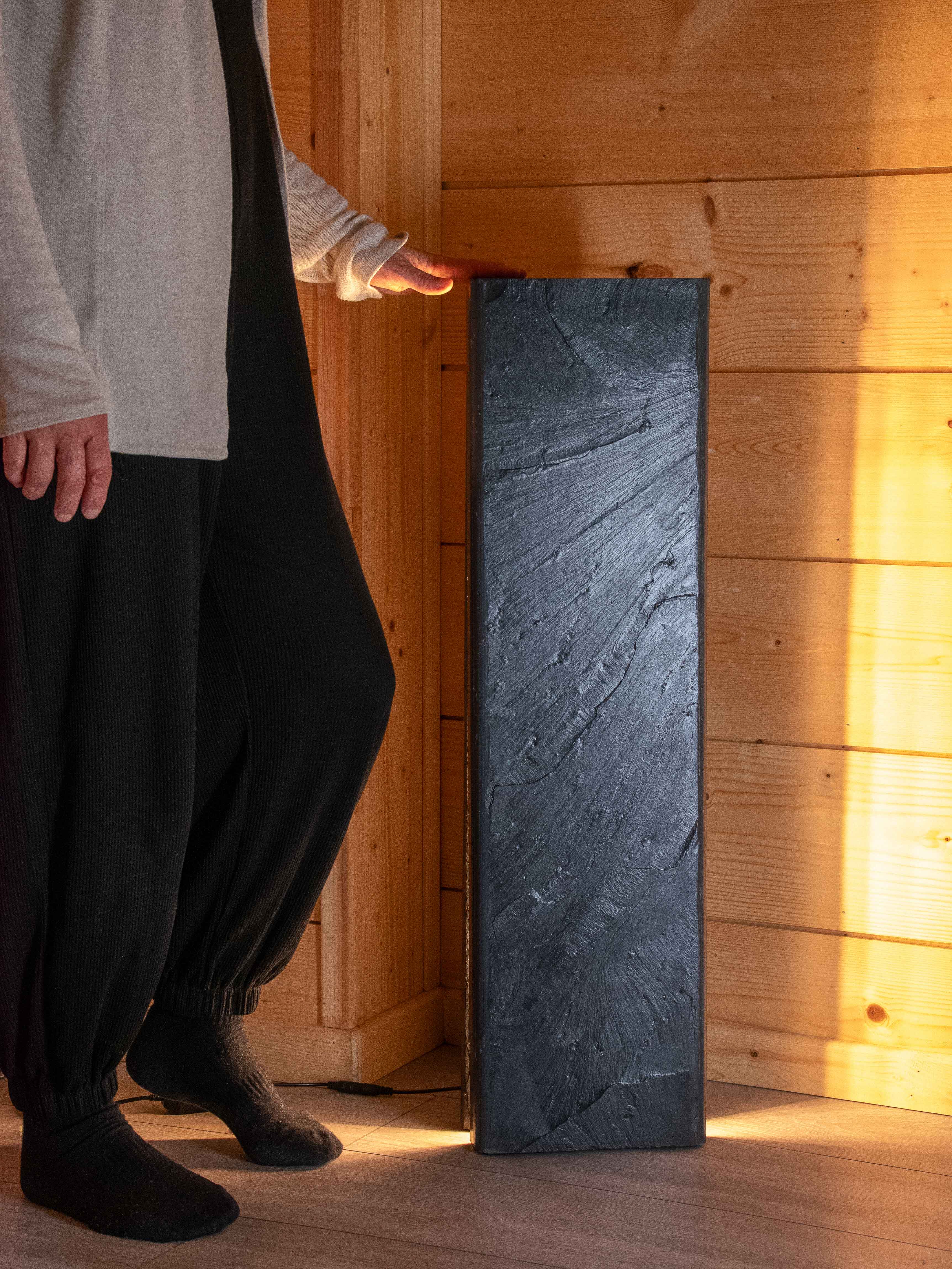 Le luminaire Pan grande échelle, pièce ultime de la gamme, nous plonge dans la matière et exalte les détails de sa petite sœur Pan. Inspiré des pans d’extractions, notamment des Pans de Travassac, vestiges ardoisiers corréziens, le luminaire Pan est un hommage aux savoir-faire ardoisiers et à l’histoire de l’ardoise. Au cœur du luminaire, la lumière diffuse met en avant le veinage créé par la fente.